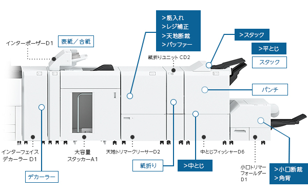富士フイルムビジネスイノベーションは、プリント出力に連携した高速かつ高精度の中とじ処理や、天地断裁、筋入れなどの新たな後処理技術を開発し、機能向上に加え、用紙の汎用性と生産性向上を実現しました。そして、プリンター本体や後処理モジュール間のインターフェイスの統一と用紙制御の最適化により、後処理機能を各モジュールに分割でき、必要な機能を自由に選択・拡張することができます。さらに、インターポーザー機能を前段に配置し、プレプリント用紙などを表紙や合紙として全ての後処理に挿入できます。