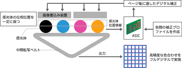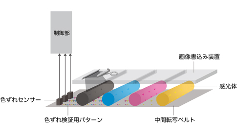 まず、モーター制御により4色の感光体ドラムの相対的位相を一定に保った状態で、各色間の色ずれ情報を光センサーで読み取り、感光体ドラム周期変動を小さくするための位相ごとに変化する色ずれ補正値を作成します。そして、画像データと位相情報をもとに感光体周期ごとに適切なデジタル補正を行います。これにより、従来の感光体ドラムの速度制御による補正に比べて、高精度な色ずれ補正が可能になります。
