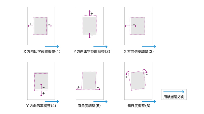 用紙に対するプリント画像のずれは、出力物の品質に大きく影響します。そこで、一部のプロダクションプリンターでは、補正量レンジを拡大することで、高精度な表裏見当合わせを実現しました。以下6項目を表裏独立させて設定することで、さまざまな用紙の表裏見当合わせを調整することが可能です(図3)。プリント画像の書き出しのタイミングにより印字位置を調整する「印字位置調整」(1)(2)、倍率補正により出力画像の長さを調整する「倍率調整」(3)(4)、スキュー補正によりプリント画像の菱形変形や傾きを調整する「直角度調整」(5)、「斜行度調整」(6)があります。