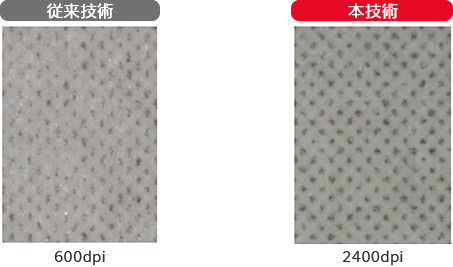 図1は、ハイライト部のプリント出力の拡大写真ですが、従来の600dpiベースの技術では、ドットの形状が不安定なのに対して、2400dpiベースのHQデジタルスクリーン技術では、安定した画像が再現されています。