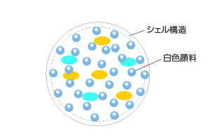 ホワイト画像は、従来のカラー画像と色の発現原理が異なり、すべての色の光を屈折、または散乱させることで白色を発現します。そのため、高い白色度のホワイト画像を形成するには、高屈折率の白色顔料が画像中に高濃度で均一に分散していることが重要になります(図1)。従来の混練粉砕製法トナーでは、トナー表面に白色顔料が露出することにより、電気漏えいによる帯電不良や、感光体や転写ベルトなどの部材へダメージを与える懸念がありました。そこで、EA製法技術を進化させることにより、高濃度の白色顔料の均一分散を実現し、さらにトナー表面に形成するシェル構造を精密に制御することで、白色顔料の表面露出を制御しました。これにより、ゼログラフィーシステムへの適用を可能にし、オフセット印刷以上の高い白色度を実現しています。(図2)。