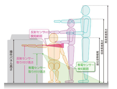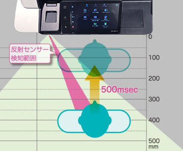 スリープモードにおいて節電ボタンを押下し、“カチッ”という音と画面の点灯によりスリープ状態が解除されたと認識するまでの時間は、約500msecです。このことから複合機に正面から近づいた際にお客様操作位置である複合機前面に到達する時間が500msecとなる適切な距離を反射センサーの操作者検知距離としました。立位姿勢と車椅子使用者を想定した座位姿勢のどちらの場合においても検知可能な最適な高さにセンサーを配置しています。