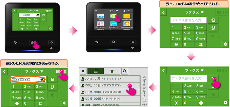 また、ファクス同報送信およびスキャン(メール送信)においても、アドレス帳から相手先を選択し送信を行った場合、その宛先を送信後も保持します。*3この場合も、上述と同様に、ホームボタンを押しホーム画面に戻り、保持された宛先を解除してから、宛先入力操作を行ってください。