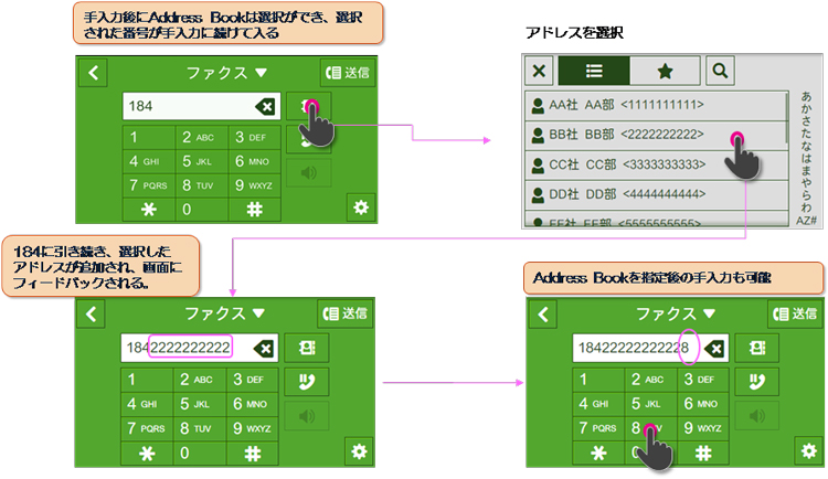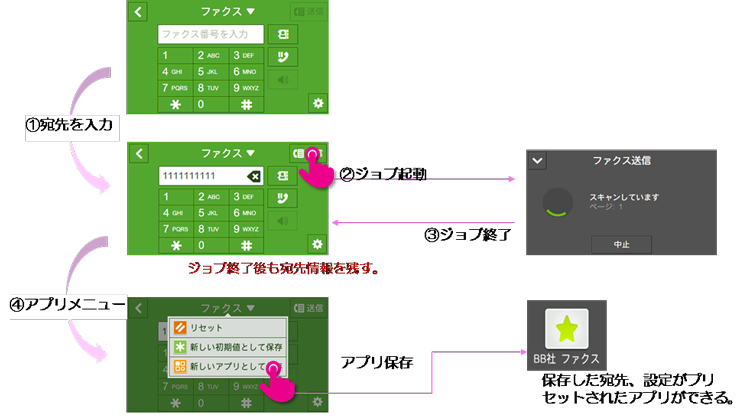 - *1 ファクス番号のアドレス帳への登録や、新しいアプリとして登録するために、ファクス番号をホーム画面に戻るまで保持いたします。