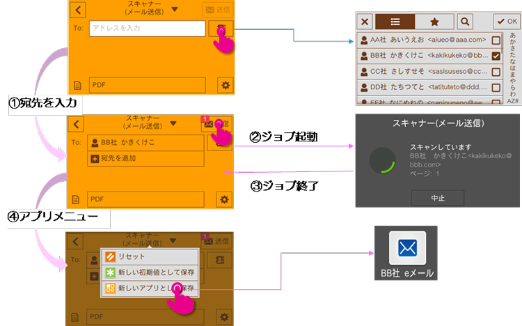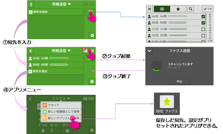 - *3 ファクス送信(同報送信)、スキャン(メール送信)アドレスの登録や、新しいアプリとして登録するために、送信先をホーム画面に戻るまで保持いたします。