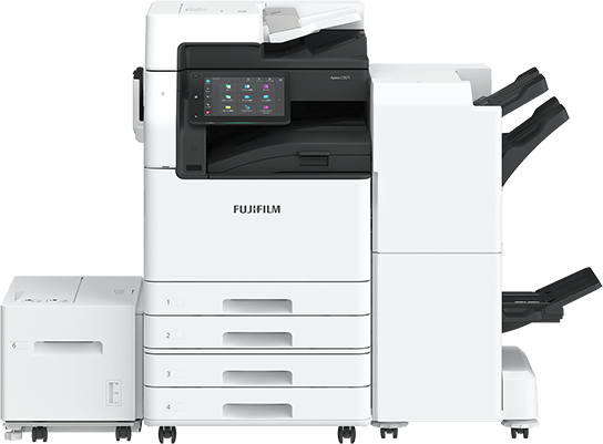 フラッグシップモデルとなる「Apeos C7071」シリーズ*3は、オフィスのセンターマシンとして業務遂行の中核となる複合機です。印刷速度70枚/分から25枚/分までの計6商品をラインアップしており、高速・中速機となる「Apeos C7071 」など*4では、1パス両面自動読み取りで毎分270ページの高速スキャンが可能です。業種業務を問わず、さまざまなオフィス環境で紙文書の電子化をスムーズに行えます。また、中速・低速機となる「Apeos C5571」など*5では、毎分160ページの1パス両面自動読み取りに加え、名刺やレシートサイズの用紙を連続で自動読み込み可能なスキャナーを搭載し、社内での情報共有や経費処理作業などを効率的に行えます。さらに、「Apeos C7071」シリーズ*6では、出力時に針なしステープル機能*7やZ折り・三つ折り*8などの多彩な後処理工程にも対応します。