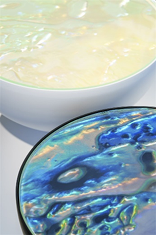 自然が生み出す美しい「構造色」は、古代から装飾品にも用いられてきました。「構造色インクジェット技術」は、富士フイルムグループの分子制御技術を応用し、フィルム基材上に吐出したインク内に微細な構造を形成して発色させるものです。色味の異なる構造色を発現するインクを複数種用意し、その組み合わせやインクの濃度を調整しながら、構造色のパターンやグラデーションなどを自在に描画することで、高い意匠性を実現します。
