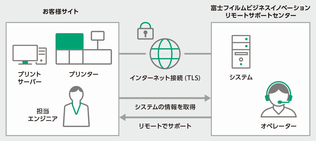 プリントサーバーのソフトウェアパッチを自動的にダウンロード、稼働ログの定期取得、トラブルログなどのデータ送信機能により、トラブルの発生を抑止するとともに、修理の迅速化を実現し、ダウンタイムの低減を図ります。
