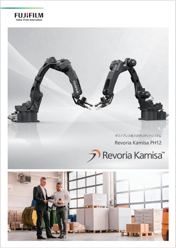 Revoria Kamisa PH12は、印刷後の大判用紙の束をつかみ、風入れをし、持ち上げて紙揃え機に運ぶ、断裁前の一連の作業負荷軽減と省人化を実現。印刷オペレーションに新たな革新をもたらします。