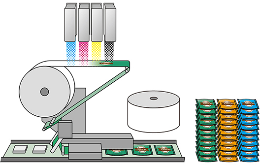 通常、包材は包材メーカーが製造し、食品メーカーなどのブランドオーナーはその包材を大量に在庫して充填・包装で使用しています。上記のケースでは、生産ラインでの商品切り替えのたびに、包材も切り替える必要があります。
