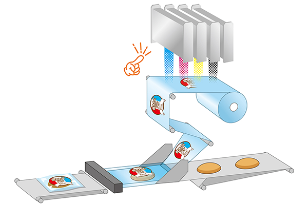 しかし、ここにインクジェット印刷をインライン化し、包材への印刷を充填・包装の直前にできれば、包材切り替え工程がなくなり、ダウンタイムの削減が期待できます。