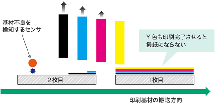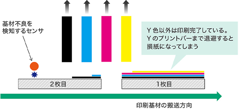 - 印刷基材の不良箇所のうち軽微なものは事前に検知し、プリントバーを退避させることが有効