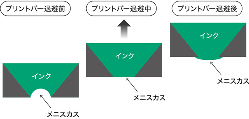 不良箇所との衝突を回避できるように、プリントバーを退避する際の加速度を決める必要がありますが、この加速度が大きすぎると、ノズルにおけるインク面のメニスカスが壊れてしまいます(図5)。すると、プリントバーを印刷位置に復帰させて印刷を再開しても、スジなどの画質トラブルが印刷物に発生します。