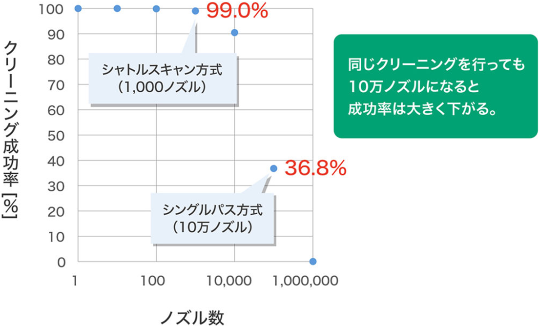 となり、クリーニングを行うと、3回のうち2回も画像欠陥が発生することになります。逆に1,000個のノズルと同様な性能を得るためのクリーニングの失敗率を計算するとP≈1/1千万程度となり、失敗率をさらに1/100程度まで低減する必要があります。