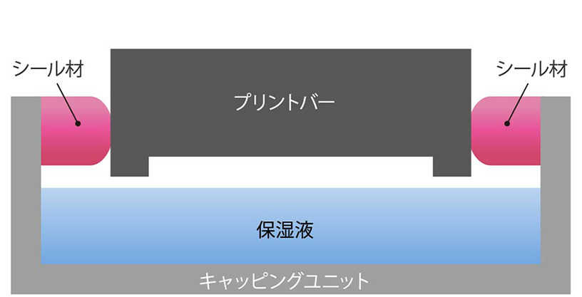 シール材は、プリントヘッドと密着することにより、プリントヘッドとキャッピングユニットとの隙間から保湿液が蒸発して湿度が下がるということを防ぐ役割を果たしています。