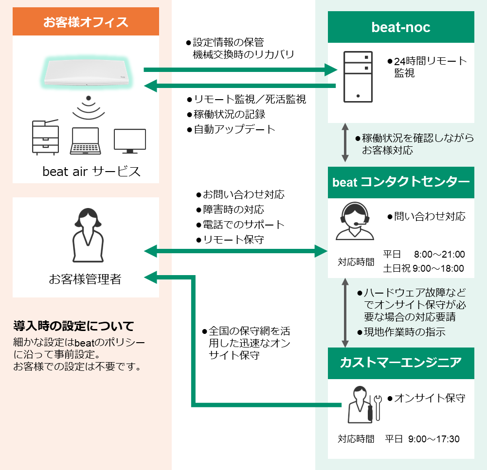 そのためお客様でのファームアップデートなどの管理作業は必要ございません。 - beat airのサポート範囲は、ネットワーク機器側に依存するものとし、クライアント設定による接続不備等のサポートは行いません。