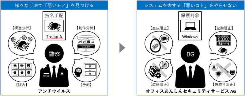 アンチウイルスのように「悪いモノ」を見つけるのではなく、システムにとって害を成す「悪いコト」を阻止します。