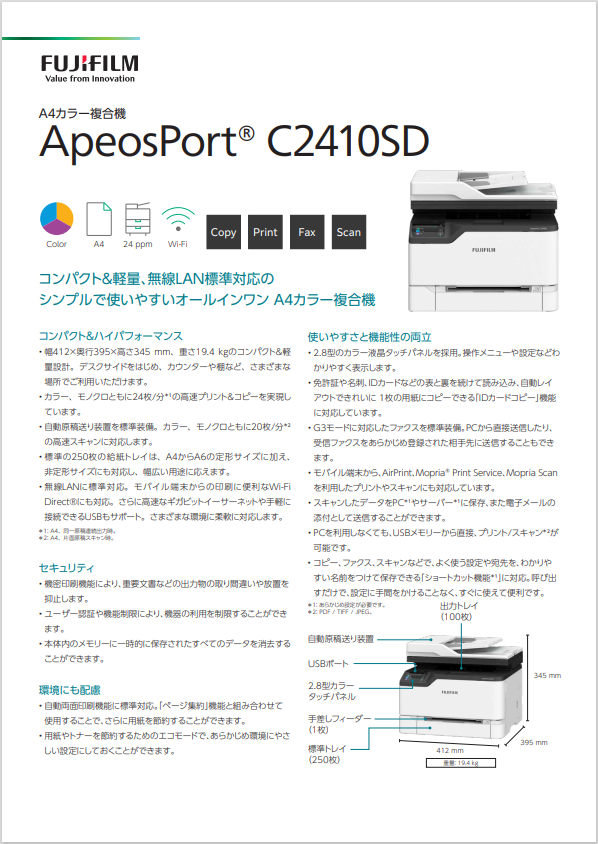 コンパクトかつ軽量で、表現力あるカラー画質も実現。オフィスから窓口業務、店舗のバックヤードなど、さまざまなプリントニーズに対応するA4カラー複合機です。