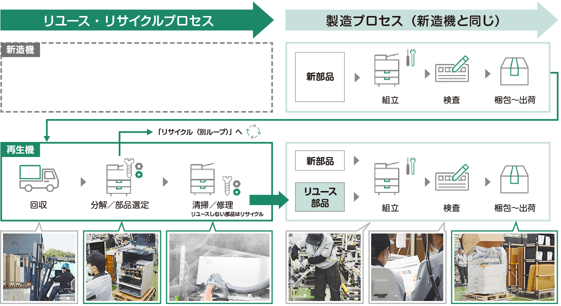 再生機の生産工程は「リユース・リサイクルプロセス」と「製造プロセス」の二つによって製造され、新品として品質・信頼性を保証します。