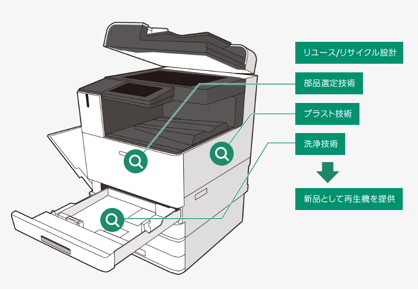 「使用済みの複合機」から厳しい基準で部品を選定。新造機と同様のプロセス、品質基準で製造し、保守サポートを提供