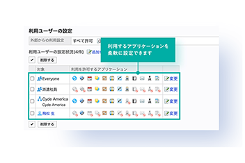 「ユーザー」「組織」「ロール」単位で利用する各アプリケーションの利用を制限できます。組織ごとに利用するアプリケーションを変えたり段階的に機能の利用を開始するなど、きめ細やかな運用が可能です。