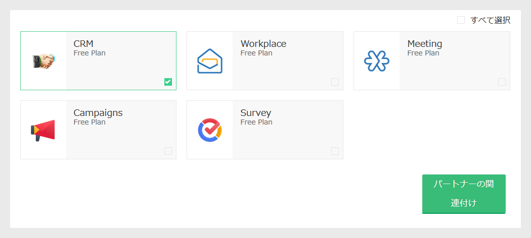Zohoサービスを富士フイルムビジネスイノベーションより購入いただく場合は、アプリケーションごとにパートナー(富士フイルムビジネスイノベーション)の関連付けをしていただく必要があります。