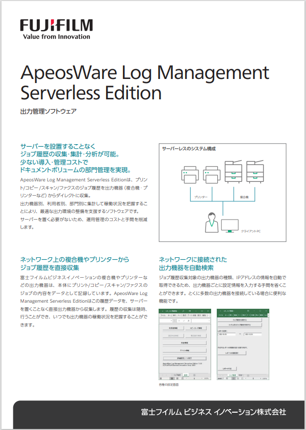 サーバーを設置することなくジョブ履歴の収集・集計・分析が可能。低い導入・管理コストでドキュメントボリュームの部門管理ができる出力管理ソフトウェア。