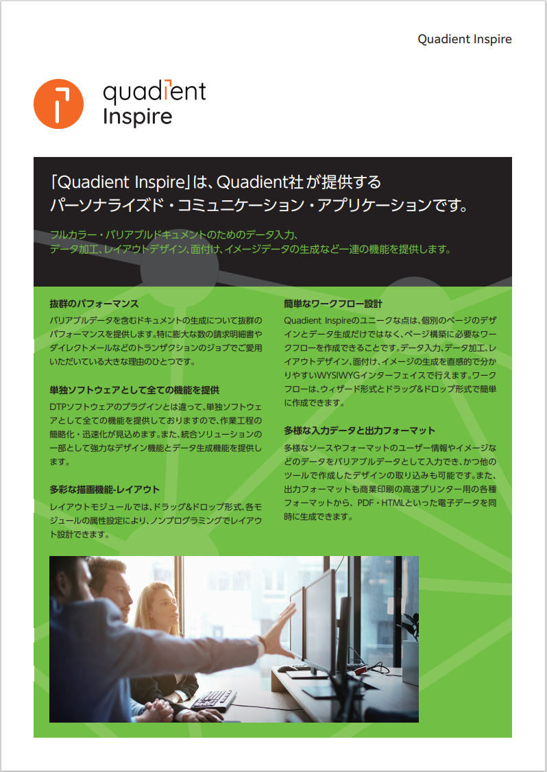 Quadient社が提供するパーソナライズド・コミュニケーション・アプリケーション。データ入力、データ加工、レイアウトデザイン、面付け、イメージデータの生成など一連の機能を提供します。