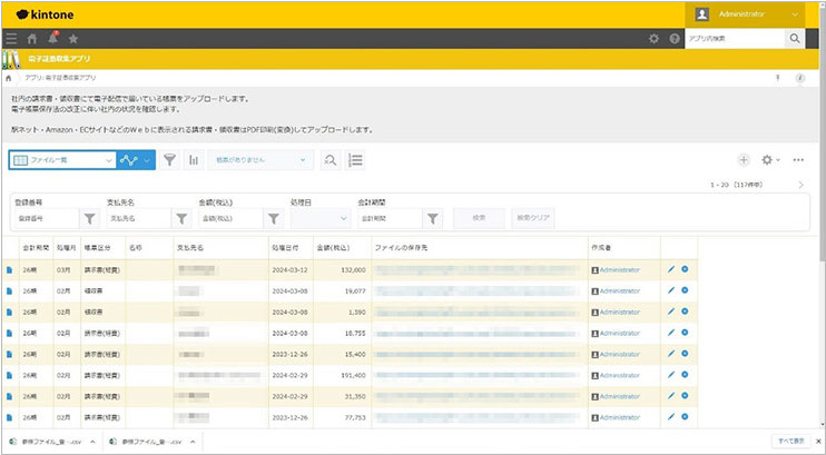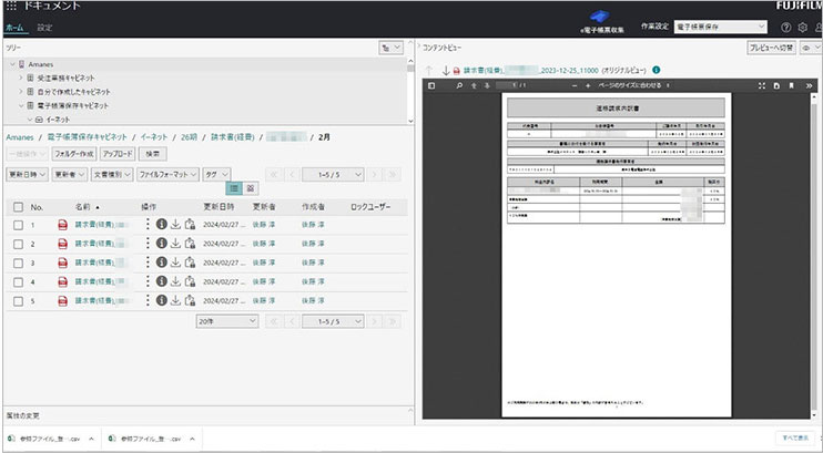FUJIFILM IWpro ドキュメントでは、ファイル名や属性情報が付与された請求書一覧を簡単に確認可能