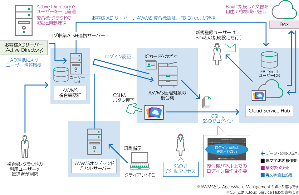 富士フイルムビジネスイノベーションジャパンからは、統合ソフトウェア「ApeosWare Management Suite」や、「Cloud Service Hub」をご提案いただき、それにより複合機と「Box」を連携させる仕組みが整いました。具体的には、「Box」に保存したデータを直接、複合機でプリントアウトができたり、電子化したデータを直接「Box」にアップロードできるようになりました。また、「どこでもプリント」を活用すれば、当社のネットワーク環境下ならどこでも複合機から印刷できますし、いちいちパソコンを介して作業をする必要もなりました。