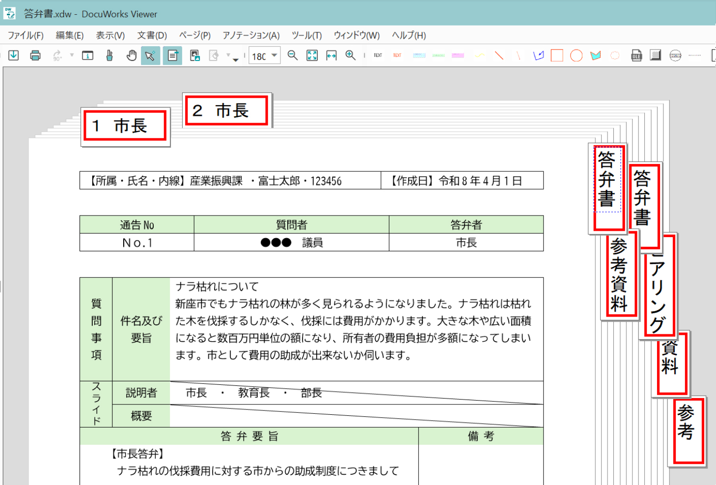 そのほかには、答弁書・会議資料の作成や配布、情報公開請求対応などにDocuWorksを活用しています。WordやExcel、PDFといった異なる種類のファイルを1つのDocuWorks文書にまとめて書き込みが出来るので資料の準備が迅速に行えます。直前の修正やページの差し替えも簡単ですので、紙の資料の頃よりも早く資料を事前配布できるようになりました。これにより参加者は会議前にゆっくりと内容を確認し、理解を深めた上で議論に臨めるため、スムーズで充実した会議運営が可能となっています。