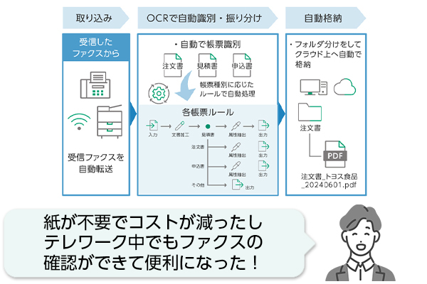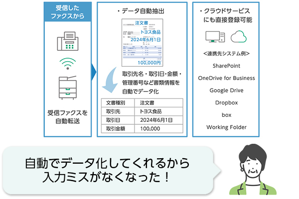 ファクス文書の内容を自動で読み取ったり、抽出した情報をCSV形式で一覧化も可能。さらに、PDF化して各種クラウドサービスへ保管することも出来ます。