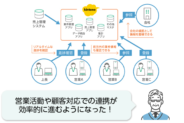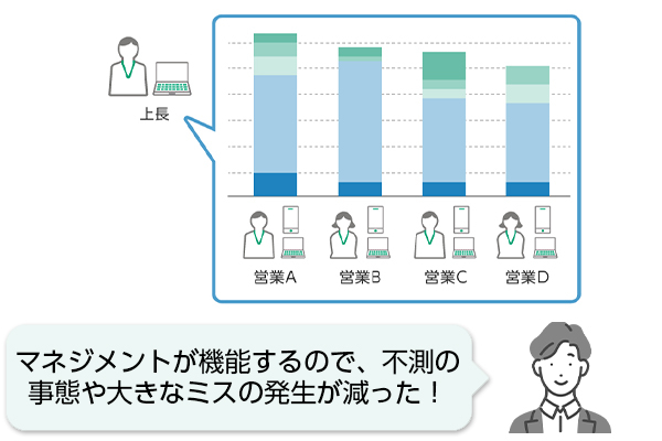 上長は各種見込みの分析ができるようになり、担当者は担当外の案件情報も必要に応じて確認できるので、属人化防止になり、不在時の対応スピードもアップします。
