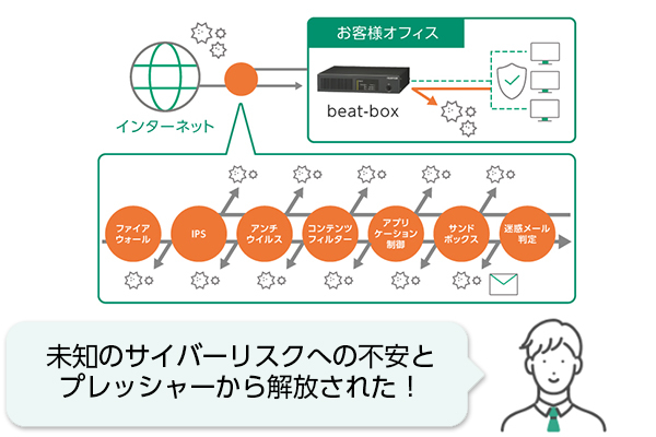 複数の防御システムが連携して対応する富士フイルムビジネスイノベーションのbeatなら、新たな脅威にも手間なく対応できます。