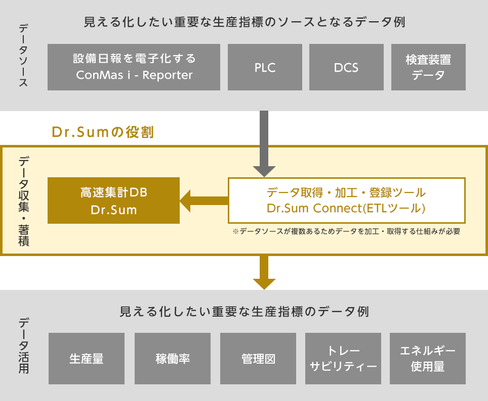 「ConMas i-Reporter」で作成した製造日報や、そのほか貴社内に存在する様々なデータを集約しデータカスタマイズするのが「Dr.Sum」です。下記のように製造現場の様々なデータを「Dr.Sum」に集約して一元管理することができます。