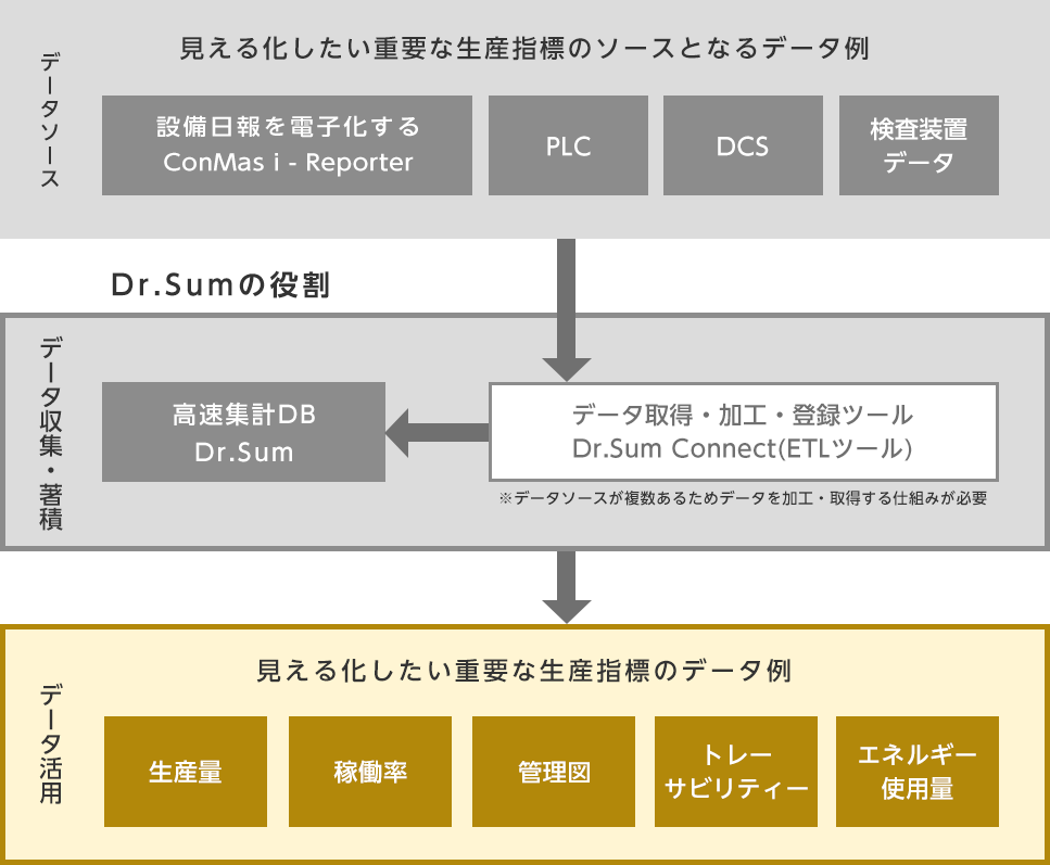 ものづくりの見える化を実現するために、「Dr.Sum」から様々なデータを抽出し、自由自在にさまざまなKPIを見える化するのがMotionBoardです。そのため、下記の様な課題を解決できます。
