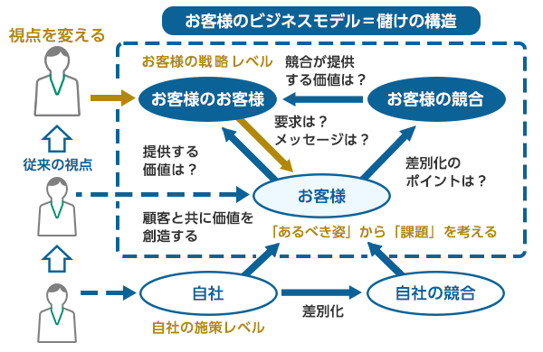 - お客様を見る目線を変える お客様(Customer)、お客様のお客様(Customer's Customer)、お客様の競合(Customer's Competitor)を見る
