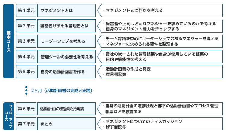 企業変革には徹底と継続が不可欠であり、その多くがマネジメント力に依存されています。本コースではマネジメントについて考え、リーダーシップの発揮できるマネジャーの育成を図ります。