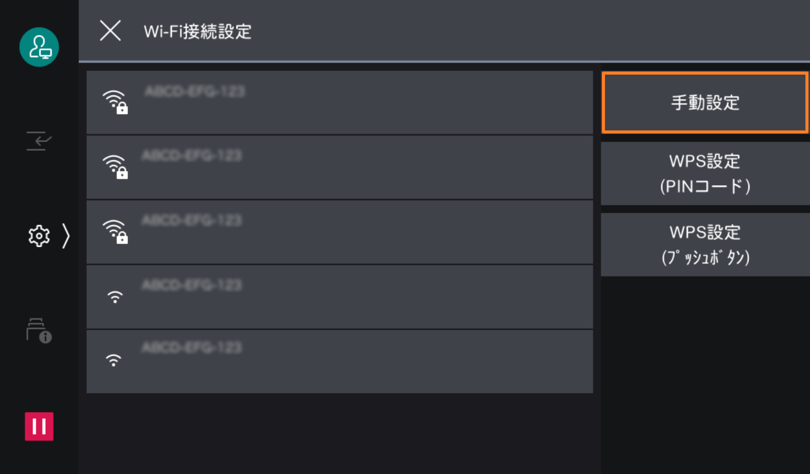 - 再起動後に再度機械管理者へのログイン後[設定]>[ネットワーク設定]>[無線LAN 設定]>[Wi-Fi 接続設定]を押し、次の「3.Wi-Fi接続設定をする」へ進んでください。