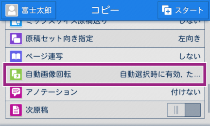 自動画像回転機能を有効にした場合、セットした原稿と、用紙トレイにセットされている用紙のたてよこ方向が異なるときに、自動的に原稿のイメージを回転させて、原稿と用紙のたてよこを合わせてコピーします。また、たて原稿とよこ原稿が混在している場合、どこを基準に回転させるかを選べます。 [コピー]画面の[自動画像回転]を正しく設定してください。