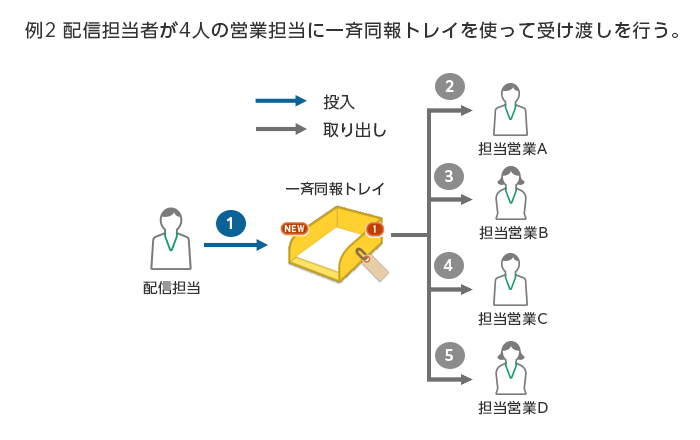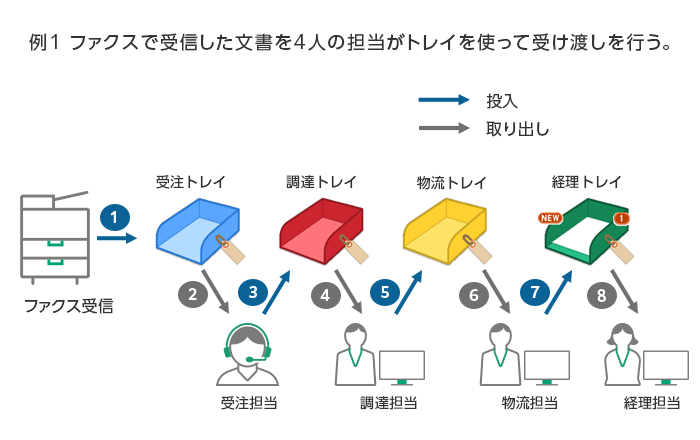 このときの受け渡し回数はトレイへの文書の投入が1回、取り出しが4回で、合計5回になります。