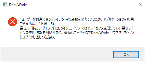 1ユーザーが利用できるクライアントPC台数を超えているため、アプリケーションを利用できません。(上限:5) 富士フイルム BI ダイレクトにログインし、「ソフトウェアライセンス管理」にて不要なライセンス使用情報を削除するか、有効なユーザーIDでDocuWorks サブスクリプションにログインし直してください。 |