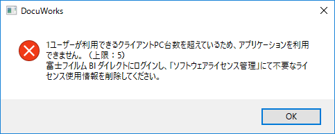 1ユーザーが利用できるクライアントPC台数を超えているため、アプリケーションを利用できません。(上限:5) 富士フイルム BI ダイレクトにログインし、「ソフトウェアライセンス管理」にて不要なライセンス使用情報を削除するか、有効なユーザーIDでDocuWorks サブスクリプション Suiteにログインし直してください。 |