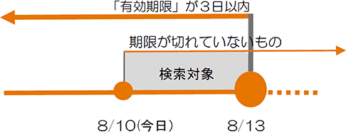 追加した属性条件をクリックすることで、「有効期限」が本日を基準として3日後以前の文書が検索されワークスペース部に表示されます。例えば本日が8/10であれば「有効期限」が8/13の文書は検索されますが、「有効期限」が8/14以降の文書は検索されません。