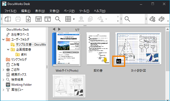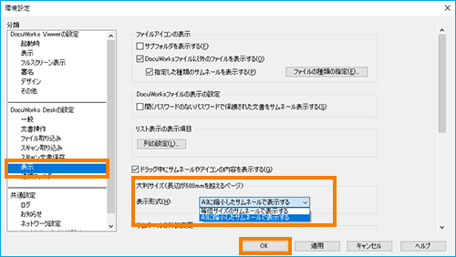 A3以上の大判フォーマットのDocuWorks文書をサムネール表示する際、「等倍サイズ」「A3縮小サイズ」のいずれかの表示方法を選択することができます。