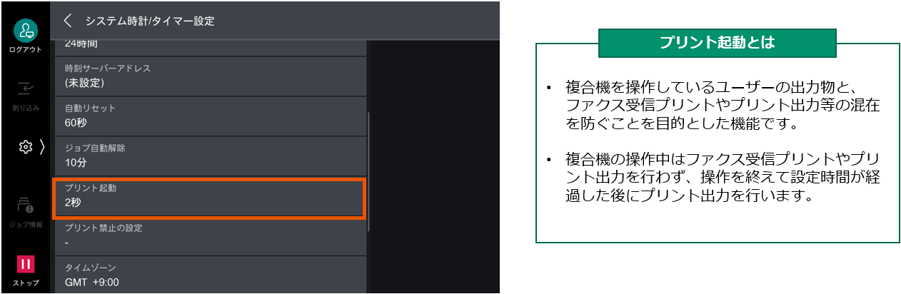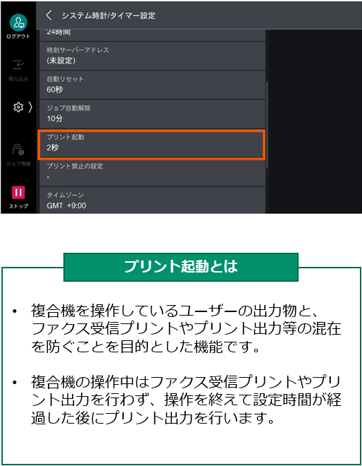 プリント起動の設定を「2秒」にすることでプリント出力の1枚目が速くなります