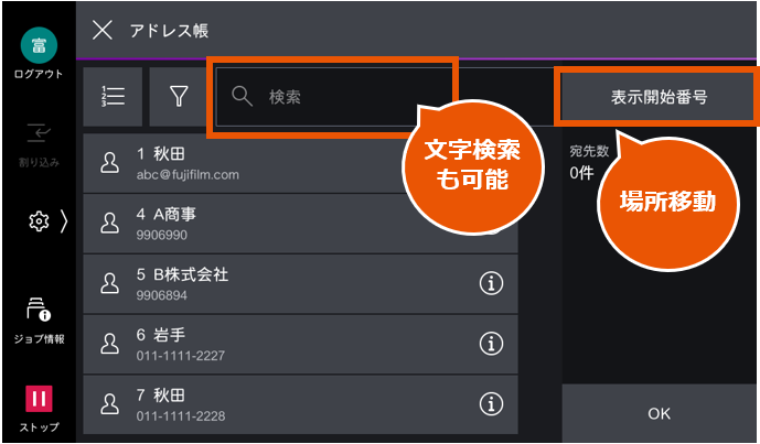 「表示開始番号」と「文字検索」が利用可能