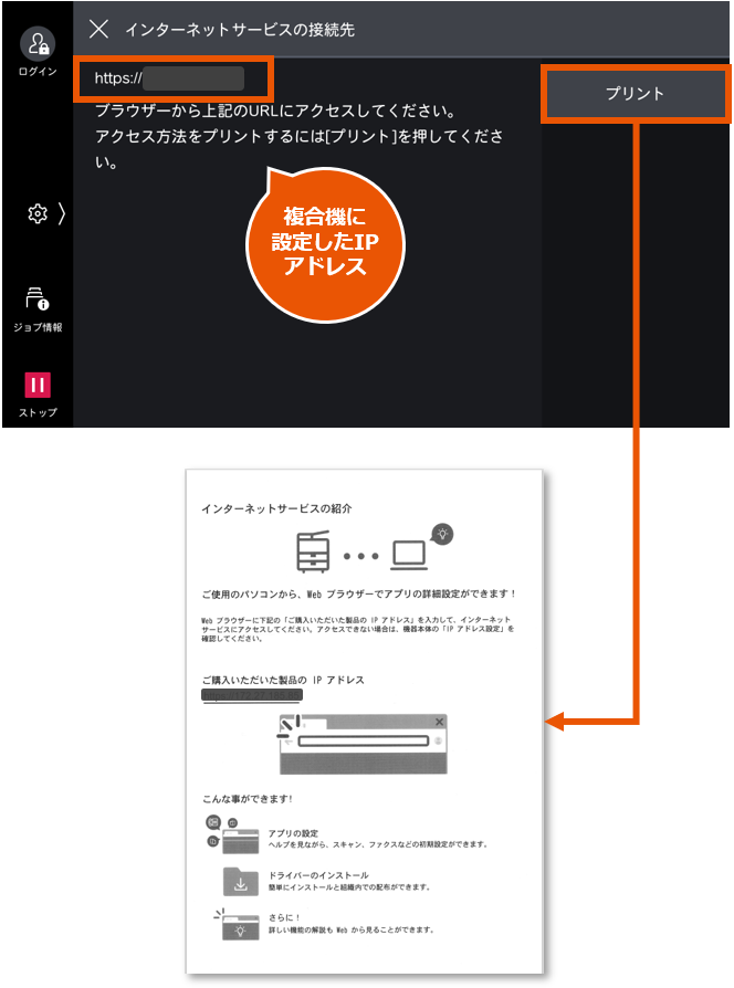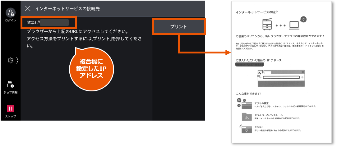 パソコンから複合機を操作したり、設定変更ができるインターネットサービス