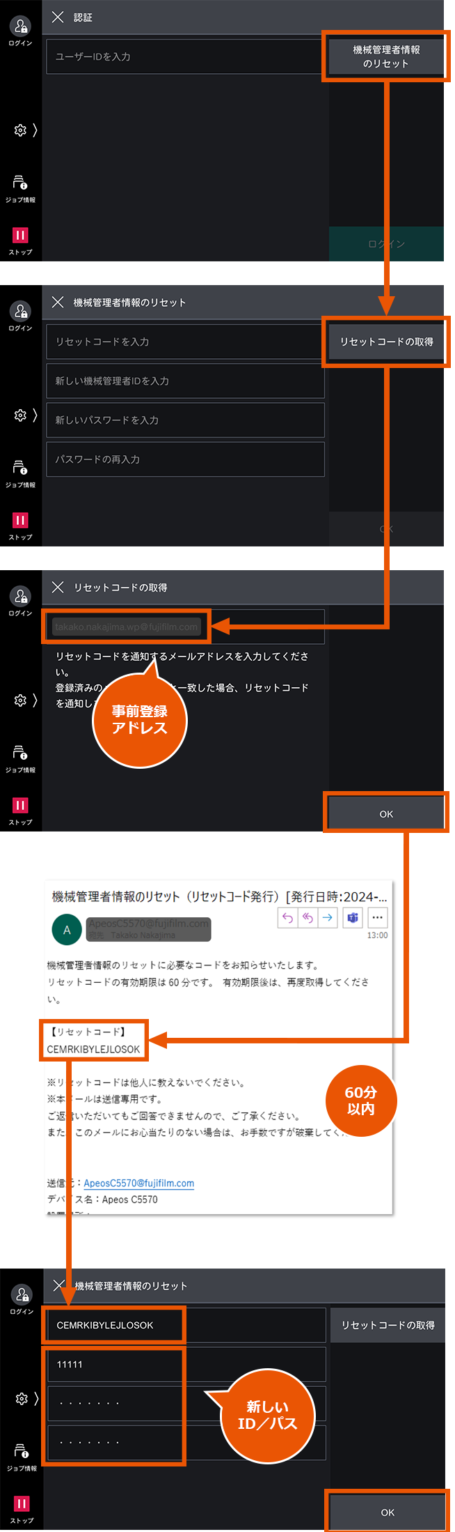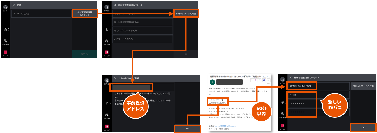 ] > 設定 > 認証/集計管理 > 認証/セキュリティー設定 > 機械管理者情報の設定 > 機械管理者情報のリセット > 許可 > リセットコードの通知先 > メールアドレスを登録 > OK