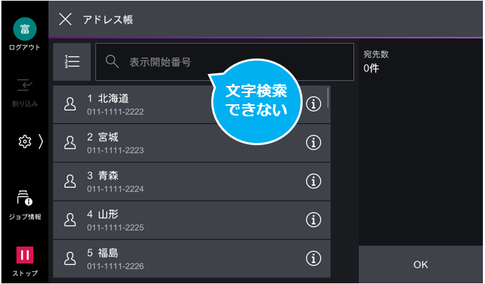 ※ ファクスアプリのアドレス帳(登録番号付きアドレス帳)画面